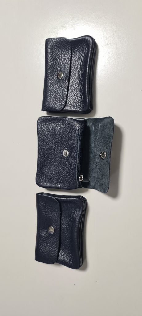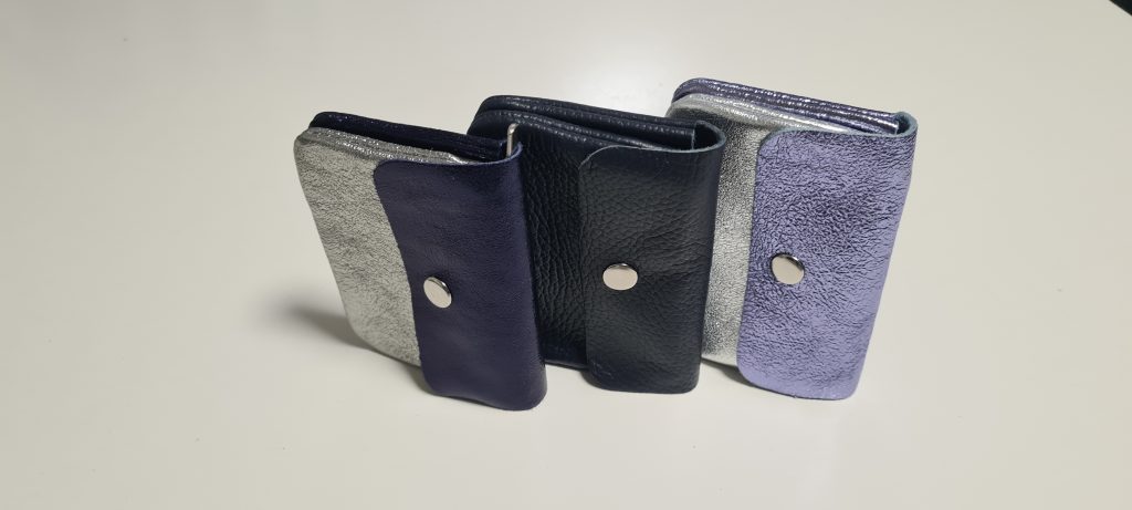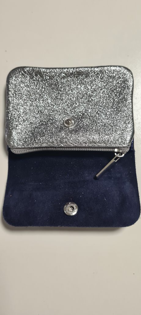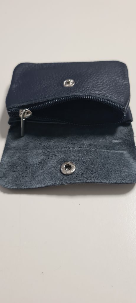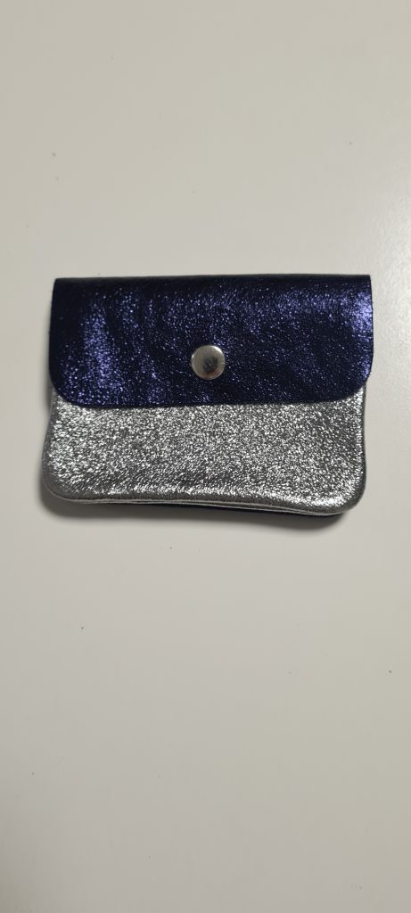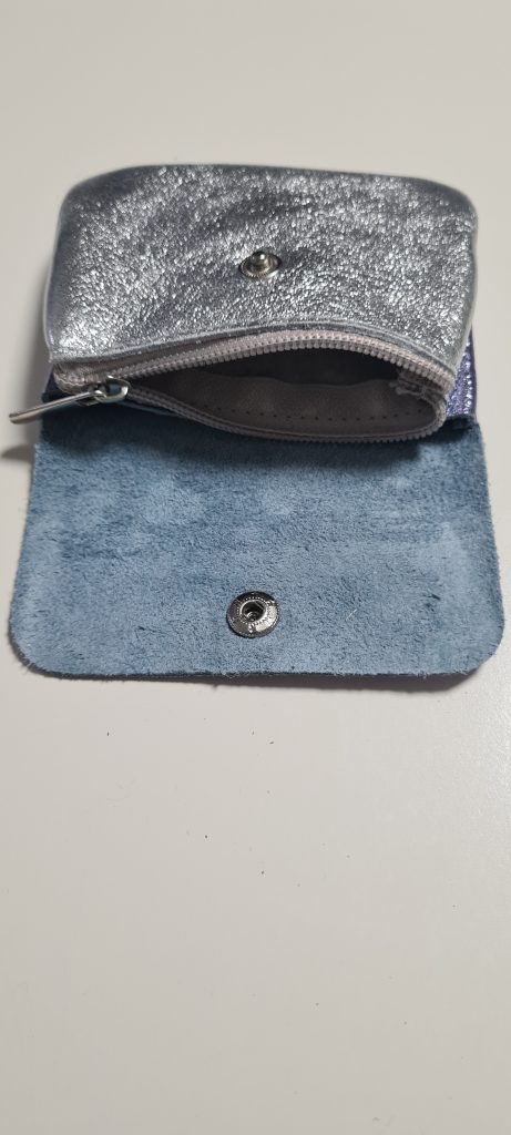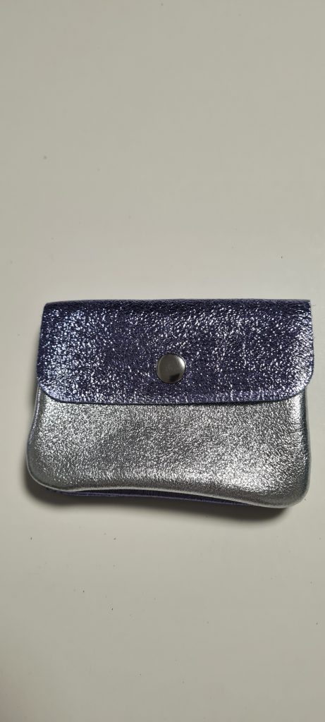 Kleine Damengeldbörse, Echtleder, dunkelblau, silbermetallic-dunkeblau/hellbau-metallic mit Druckknopf und Münzgeldfach mit Reißverschluss. Ideal für die Hosentasche oder kleine Handtaschen.