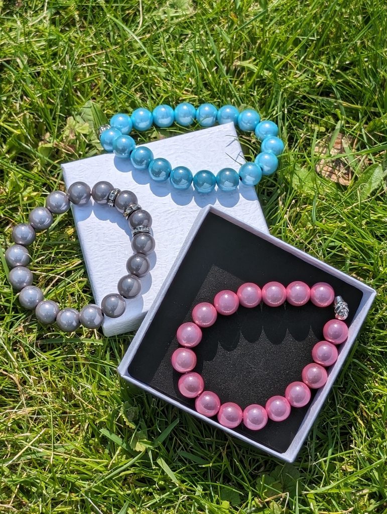 Armband „Miracle beads“, einfarbig (rosa, blau, grau). Kleine Perlen (ca 10 mm), one size, Preis je Armband: 12,90 €