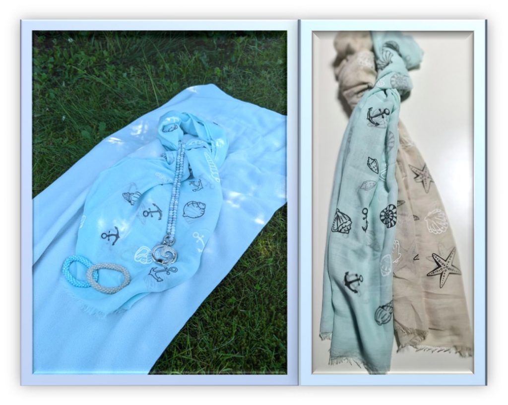 Maritimer Damenschal, beige oder türkis, leichte Viskose. Maße: ca. 180cm lang und ca. 67 cm breit.