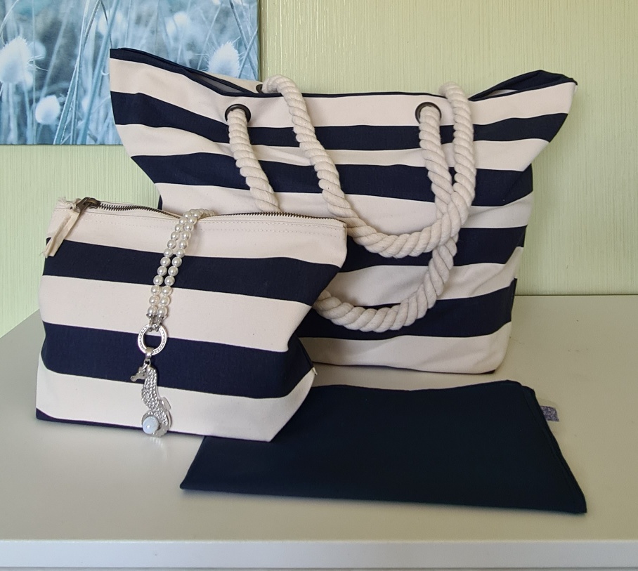 Beachbag-Set, blau-weiss gestreifter Baumwoll-Canvas, mit einer Innentasche. Als Hand- oder Schultertasche ideal als Strandtasche, oder einfach als Shopper. Robuste Seilträger ca. 60 cm. Die Beachbag hat ein Fassungsvermögen von ca. 22 l.