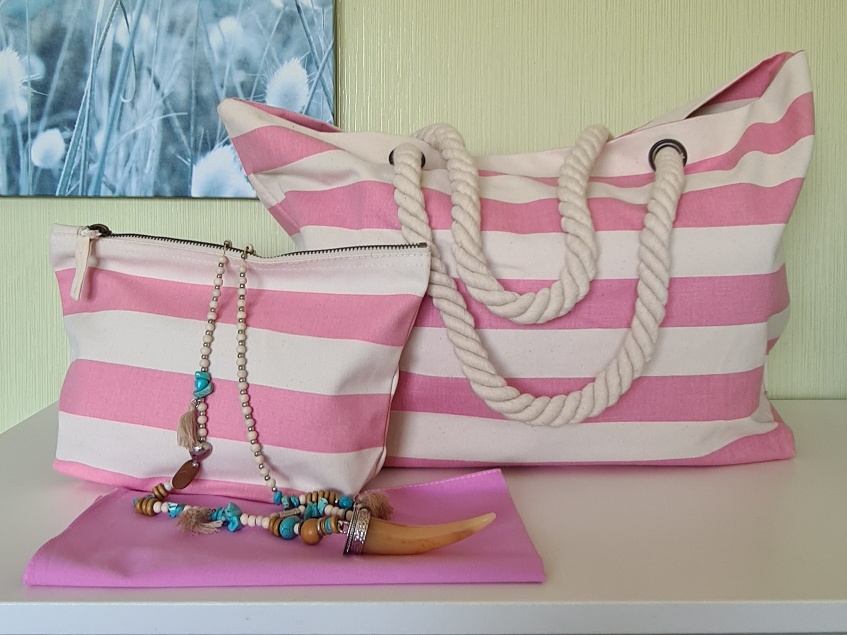Beachbag-Set, rosa-weiss gestreifter Baumwoll-Canvas, mit einer Innentasche. Als Hand- oder Schultertasche ideal als Strandtasche, oder einfach als Shopper. Robuste Seilträger ca. 60 cm. Die Beachbag hat ein Fassungsvermögen von ca. 22 l.