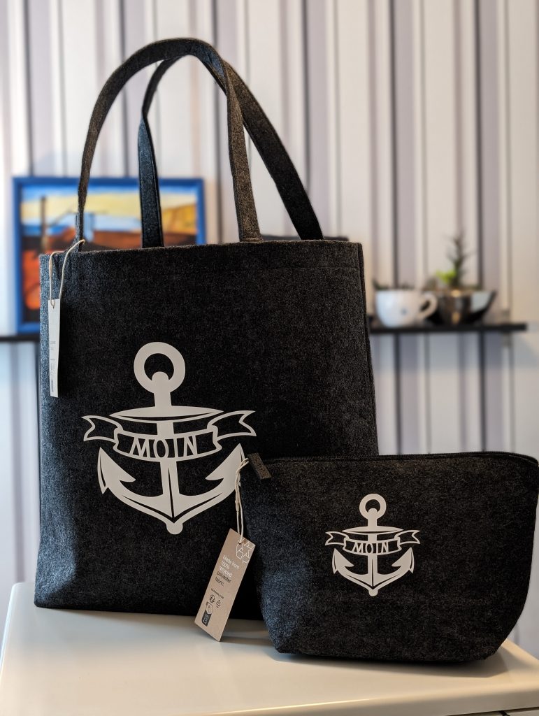 Der Shopper im maritimen Look ist aus recyceltem Filz, anthrazit mit abnehmbaren Innenfach (Klettverschluss). Der geräumige Shopper bietet ausreichend Platz und ist der ideale Alltagsbegleiter.